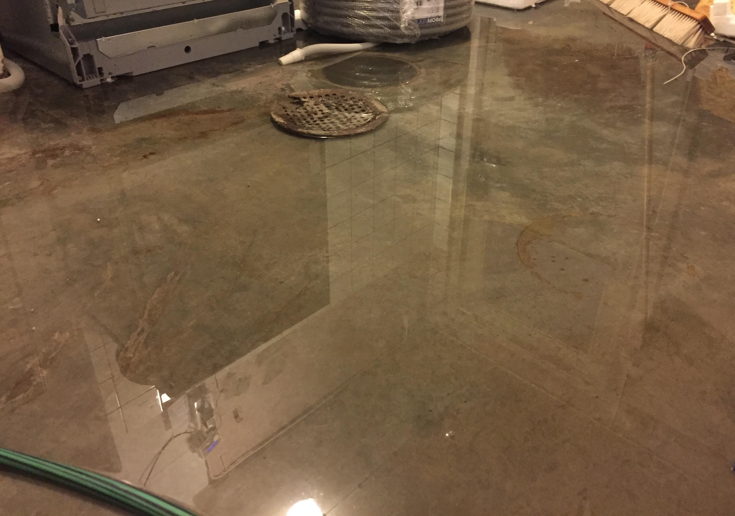 Det stor ganska mycket vatten i rummet, men det är byggt som tvättstuga och har väldigt bra fall mot brunnen – exakt, brunnen som det var stopp i.