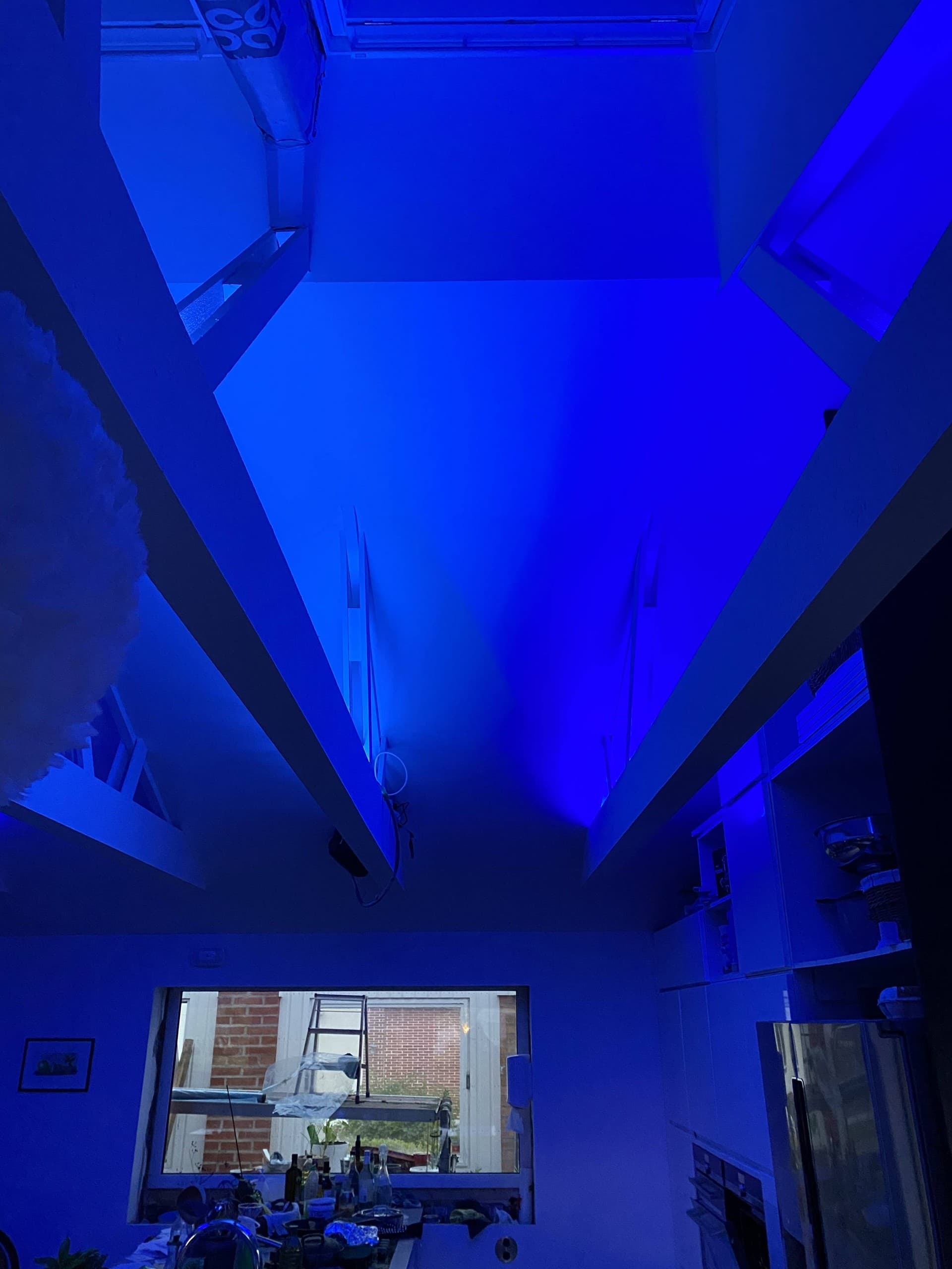 Det är några år sedan som vardagsrummet och köket blev ”klart”, och i en av takstolarna installerades en proof-of-concept för belysningen. Tanken var att köra med individuellt adresserbara LED-slingor, där man kan styra både RGB och ljusstyrka på varje individuell LED.