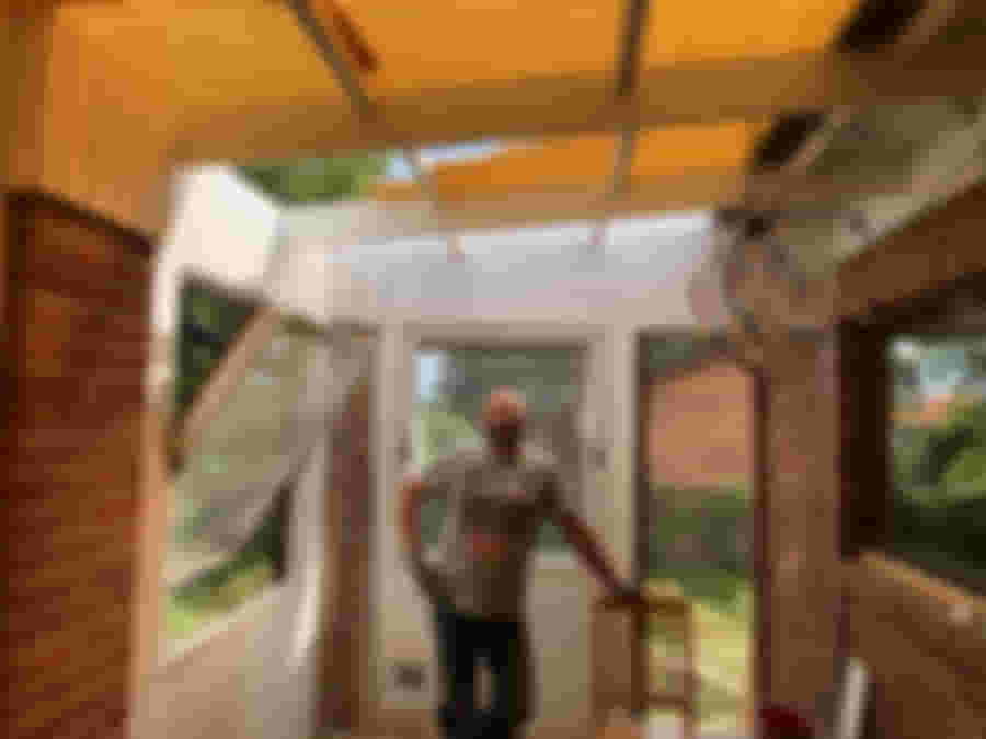 Henke ser beslutsam ut när det kommer till att byta plasttaket. Här har vi monterat bort den tillfälliga lagningen som jag gjorde.